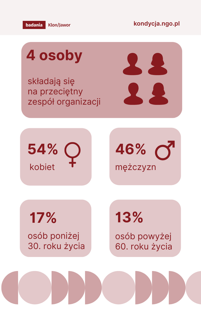 Przeciętnie w organizacji pracują 4 osoby – o jedną więcej niż w poprzedniej edycji badania. A jak wygląda zespół?