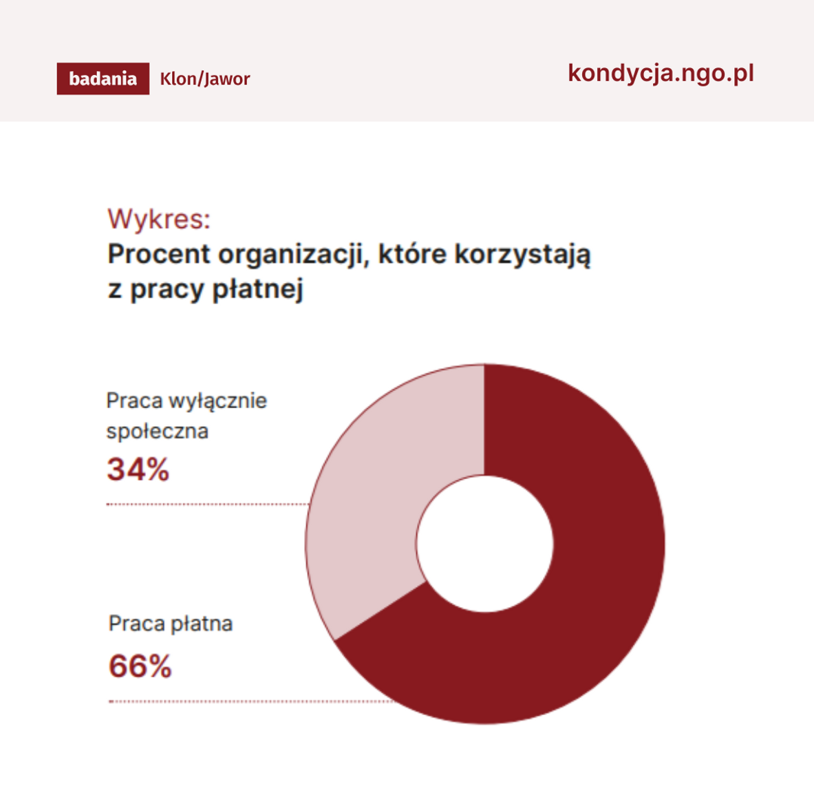 Ponad jedna trzecia, bo 34% organizacji w całości opiera swoje działania na pracy społecznej. Oznacza to, że te fundacje i stowarzyszenia nie płacą za pracę na rzecz organizacji ani jednej osobie. Pozostałe (czyli łącznie 66%) korzystają z odpłatnej pracy w różnej formie.