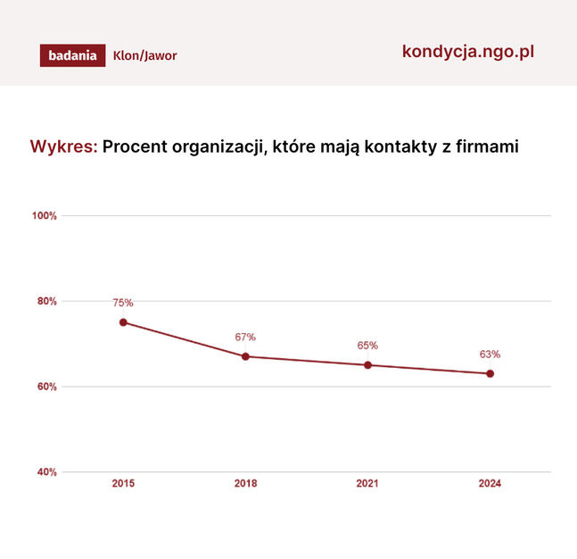 63% organizacji utrzymuje kontakty z przedsiębiorstwami prywatnymi. Dla 7% są to kontakty częste i regularne.