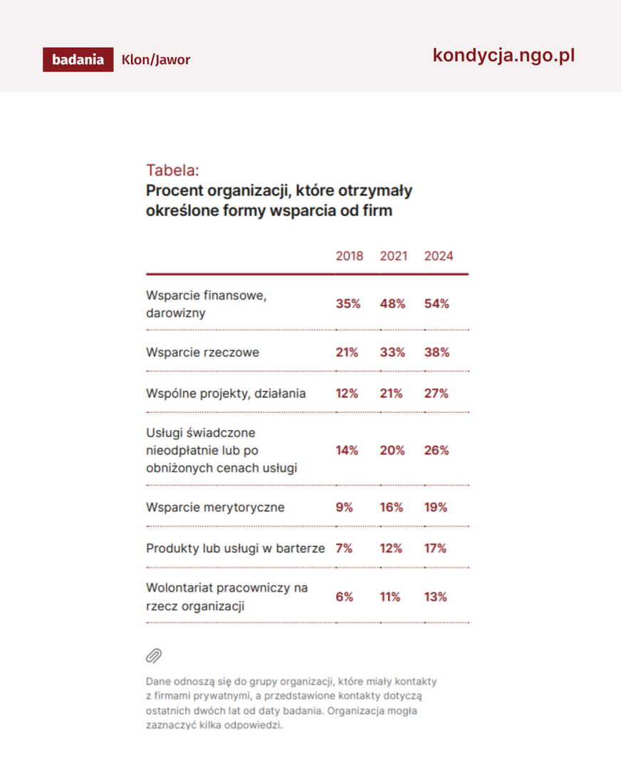 Choć podobna liczba organizacji utrzymuje kontakty z firmami, formy współpracy stają się coraz bardziej różnorodne. Ponad połowa stowarzyszeń i fundacji (54%), która ma kontakty z biznesem, mogła liczyć na jego wsparcie finansowe w ciągu ostatnich dwóch lat, a 38% otrzymało wsparcie rzeczowe w postaci materiałów lub sprzętu. W obu tych formach odnotowano znaczący wzrost współpracy międzysektorowej w porównaniu do 2018 roku.