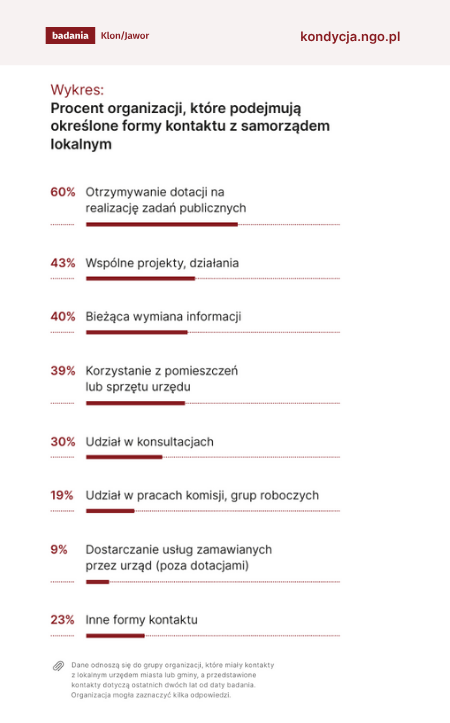 Samorząd lokalny od lat jest jednym z trzech najważniejszych partnerów organizacji pozarządowych. Obecnie 78% organizacji utrzymuje kontakty z lokalnym urzędem gminy lub miasta, a dla 43% są to częste i regularne kontakty.